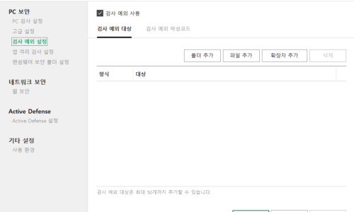 Windows용 V3 제품군은 검사 예외 설정을 제공하고 있습니다.검사 예외 대상으로 등록된 파일이나 폴더는 V3에서 더이상 검사하지 않게 됩니다.검사 예외 대상은 V3의 [환경 설정] > [검사 예외 설정]에서 추가할 수 있습니다. 검사 예외 폴더/파일 추가특정 파일이나 폴더를 검사하지 않도록 설정합니다. 파일 추가: 특정 파일을 선택하여 검사...